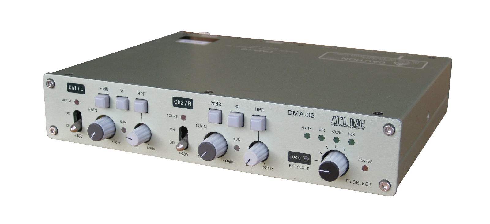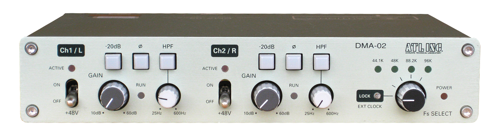 アナログ2チャンネル入力/2チャンネル出力のほかに、高性能A/DコンバータによるAES/EBU デジタル出力も搭載していますので、デジタルミキシングコンソールのヘッドアンプとして使用した場合にも高品位な音色が得られます。内部のデジタル信号処理は24bitで、サンプリング周波数は44.1KHz/48KHz/88.2KHz/96KHzが選択可能です。またワードクロック入力にも対応していますので、複数台のDMA-02を同期する運用こともできます。